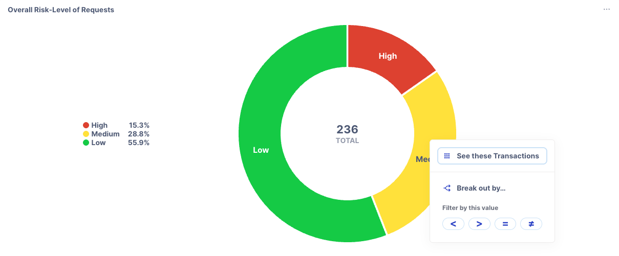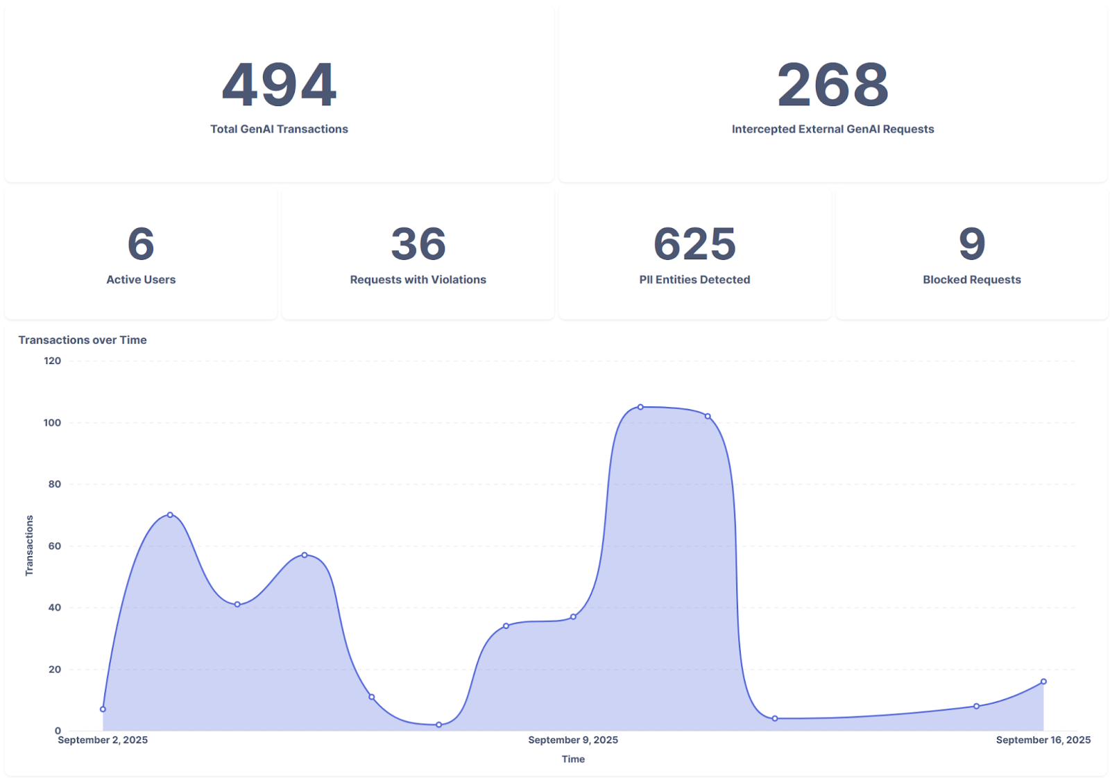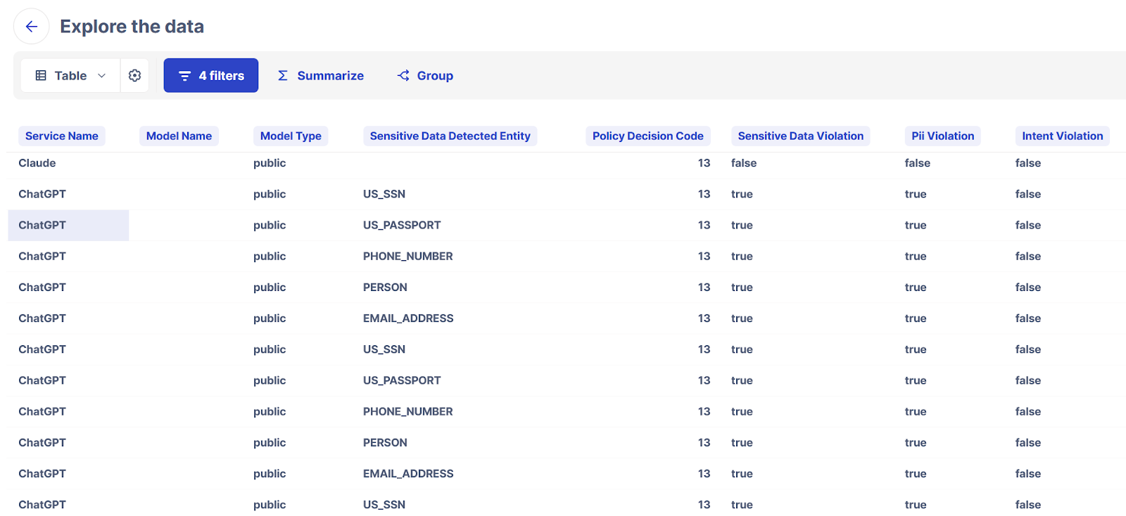 See a spike in high-risk prompts? Curious which team is testing a costly new AI tool? Just click into the chart and drill down to the underlying transactions. All of the raw data behind the dashboards is at your fingertips, ready to explore and act on.
