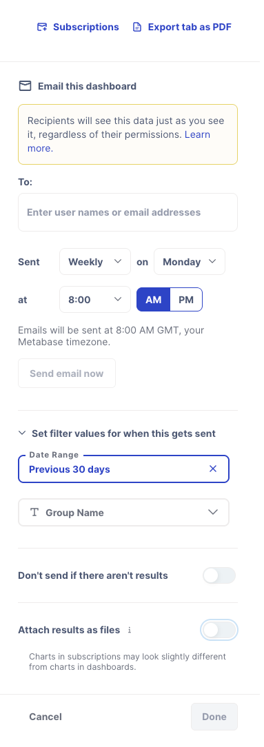 With one click, export filtered dashboards as PDFs to share with executives, board members, or department heads. For ongoing needs, set up email subscriptions so stakeholders get automated reports with the right filters applied. Reports can also be shared to those with no platform access.